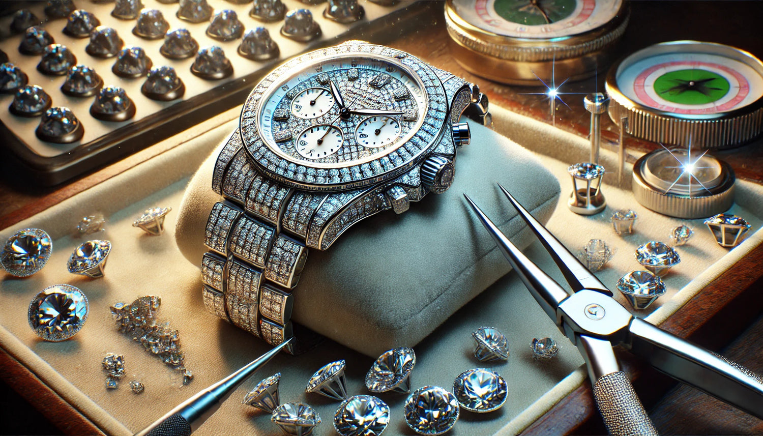 We specialize in transforming plain Jane watches into stunning, diamond-encrusted timepieces. Our meticulous diamond setting enhances your watch with brilliance and luxury, creating a truly unique and personalized accessory.